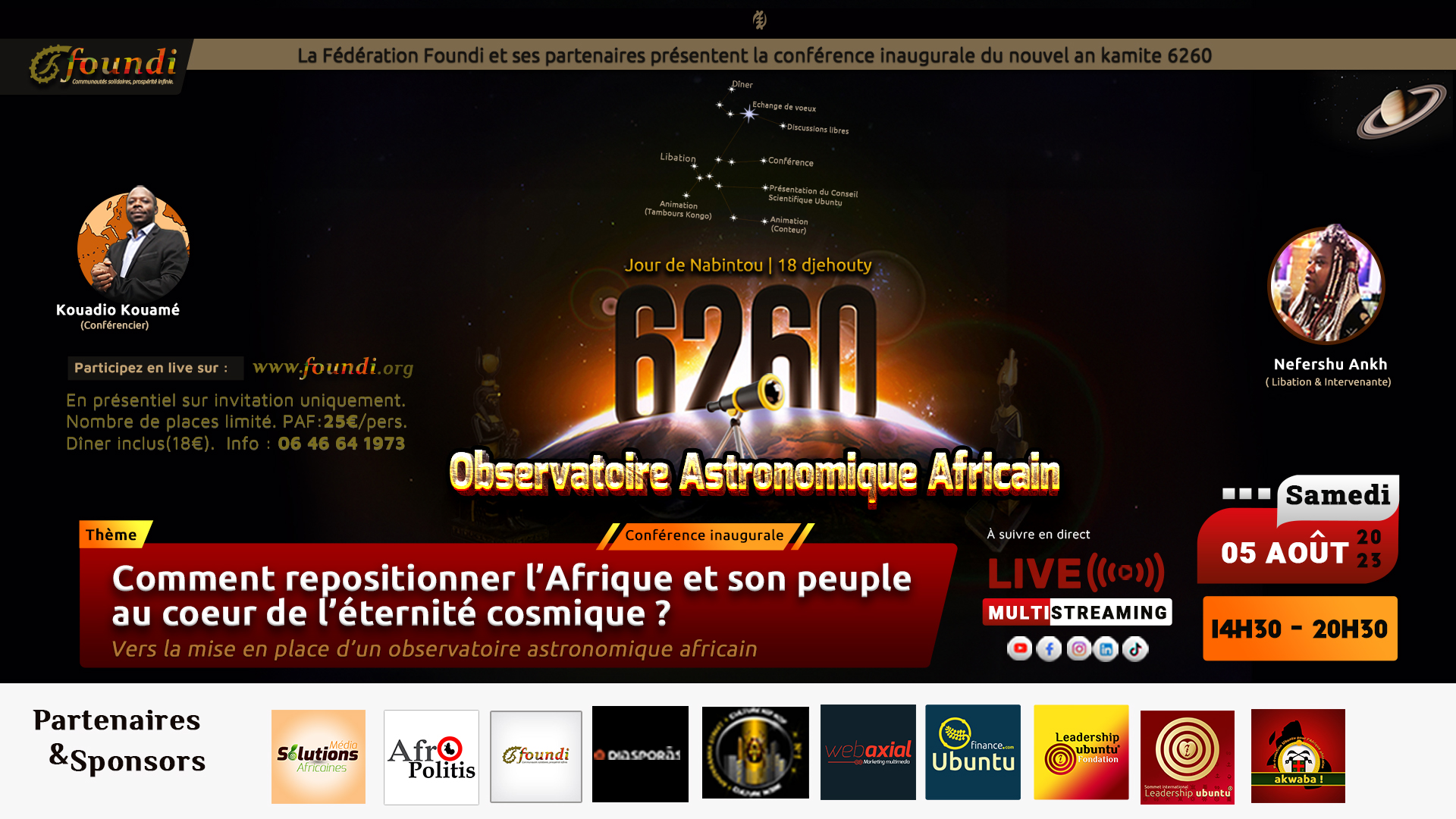 Dans le cadre de la série de célébrations du nouvel an africain, Foundi et ses partenaires organisent la conférence inaugurale de l’ère du renouveau africain 6260, ce samedi 05 Août 2023, de 14H30 à 20H30. Cette conférence portera sur le thème : « Comment repositionner l’Afrique et son Peuple au cœur de l’éternité cosmique ?(Vers la mise en place d’un observatoire astronomique africain)«